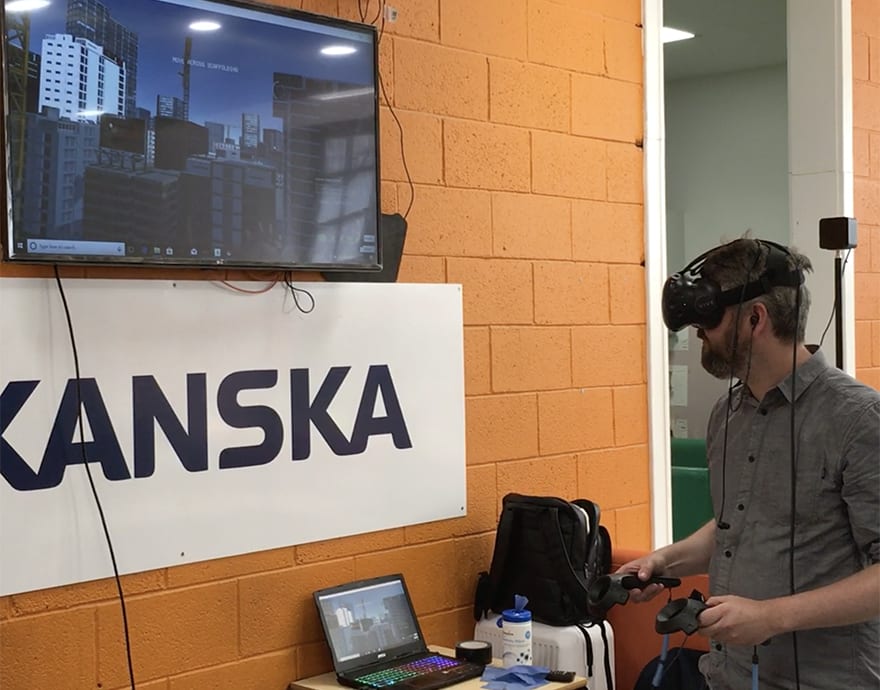 Stephen Cousins finds his head for heights as he tries out a virtual reality training system developed by Skanska.