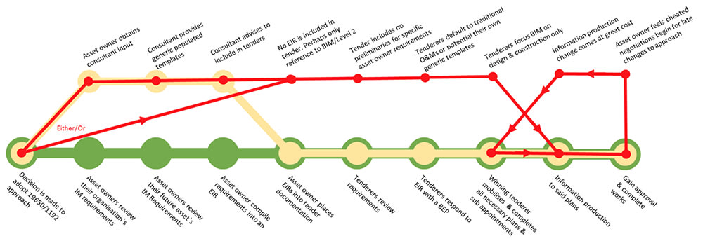 There are many training consultants in the industry that give guidance on the implementation of BIM/information management within organisations and projects specifically in the form of 1192/19650. I have had a chance to review many of the training modules provided and almost all only train on the perfect scenario (the green process line). This is a problem if the training is aimed at any other audience than clients.