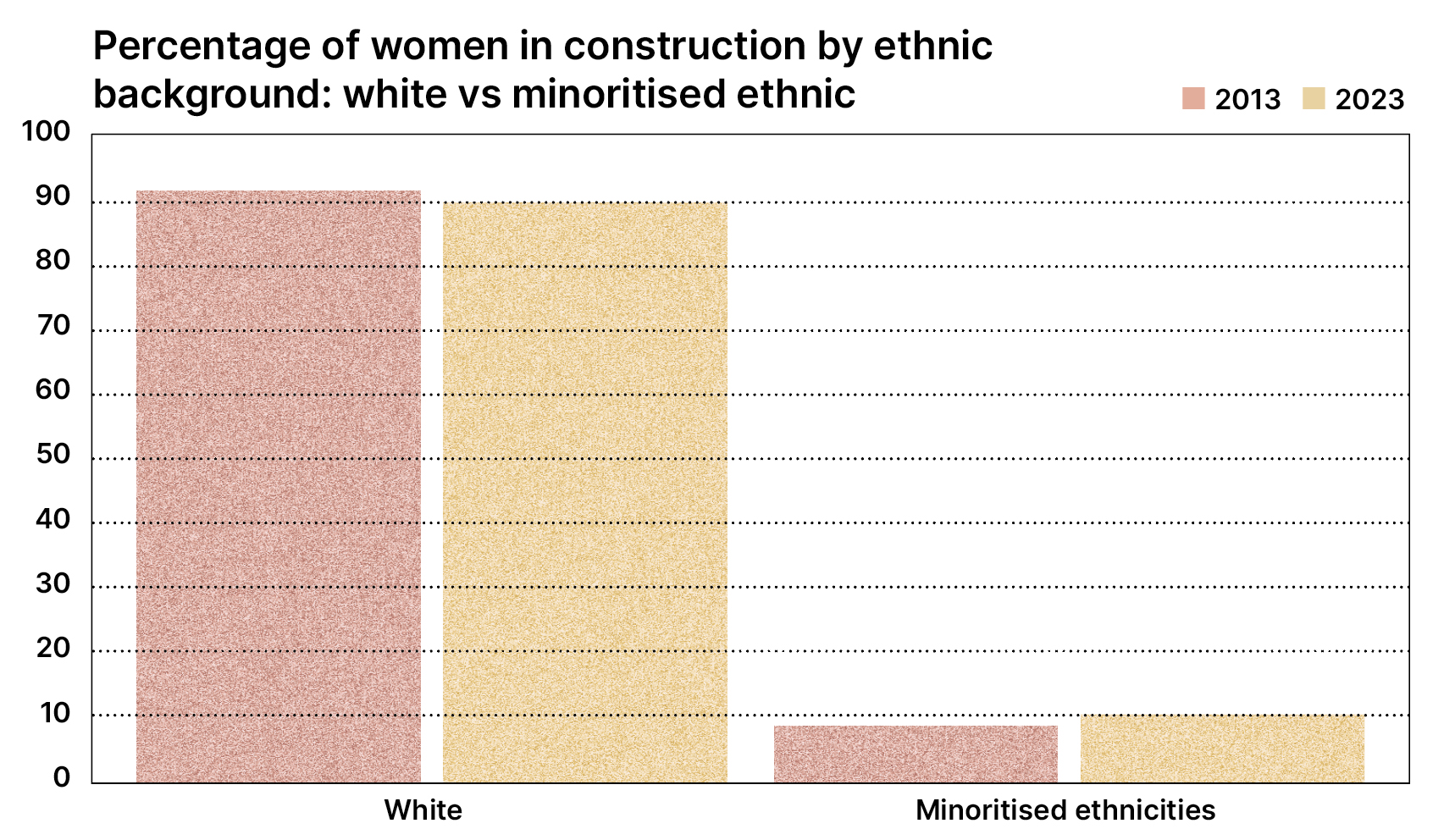 Of course, diversity means much more than this. Of that 15%, 89.3% are white, with 10.7% comprised of minoritised ethnic. This is in comparison with the 81.7% of the population made up of white people. In construction, the figures have moved in a positive direction, with minoritised ethnic representation up from 8.1% a decade ago.