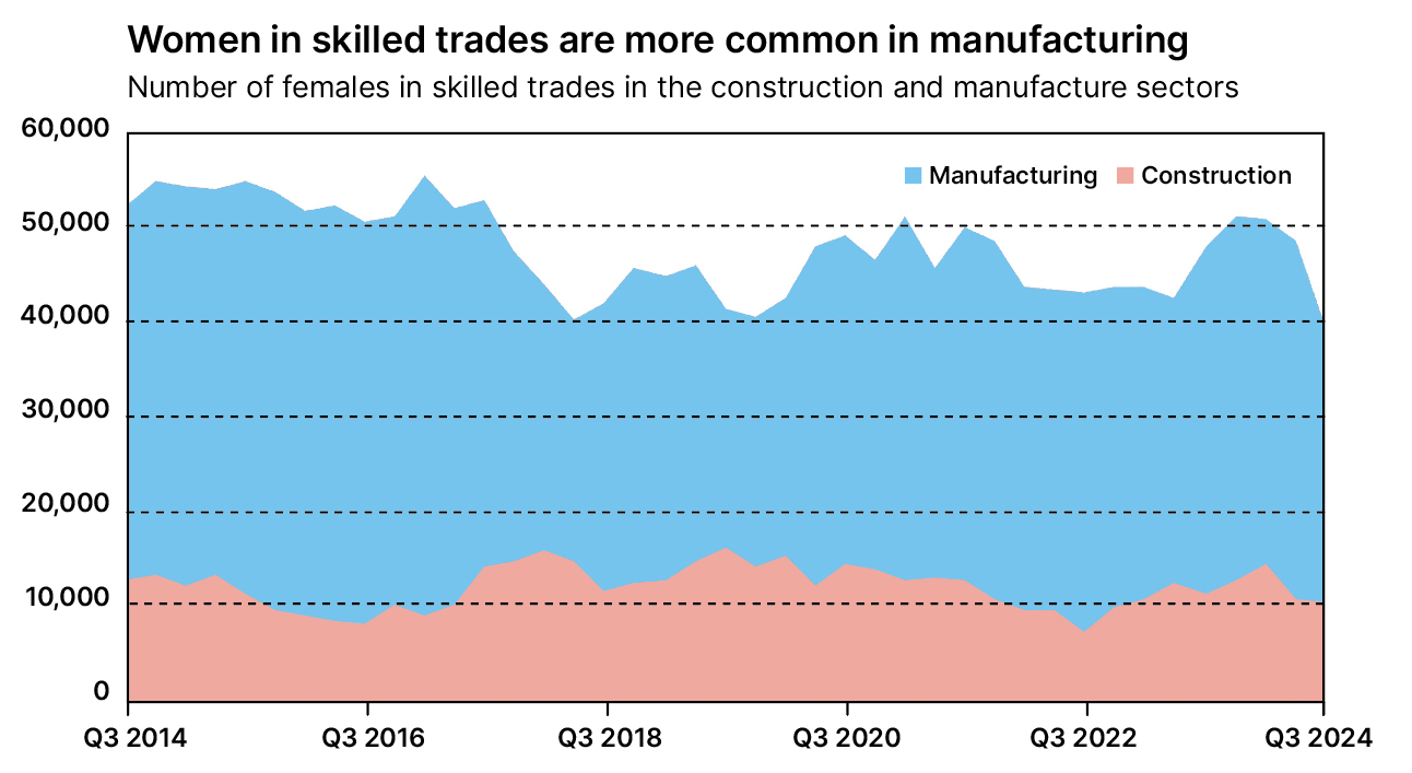 Over the last 10 years, the average number of women in manufacturing skilled trades was 47,912 out of a total workforce of 588,873, whereas construction showed a much lower average of 12,149, out of a workforce of 1,017,763.