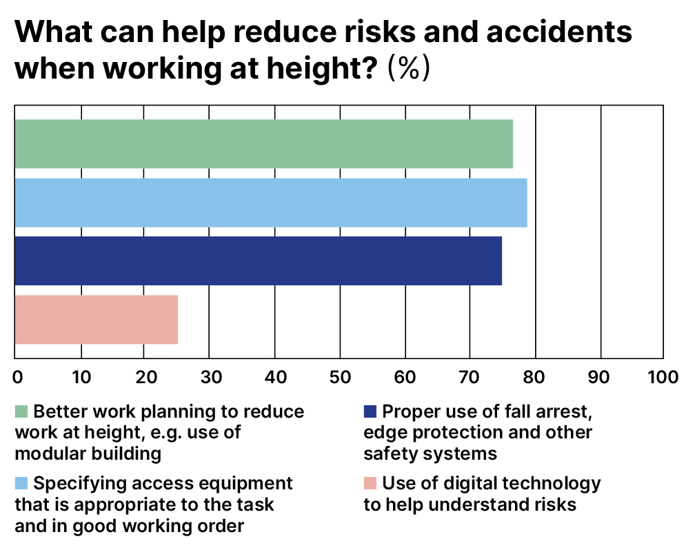 Meanwhile, respondents identified three main ways to reduce risks and accidents while working at height. Specifying access equipment that is appropriate to the task and in good working order was the most popular route (selected by 79%). That was followed closely by better work planning to reduce work at height, such as the use of modular building (76.2%), and proper use of fall arrest, edge protection and other safety systems (74.1%).