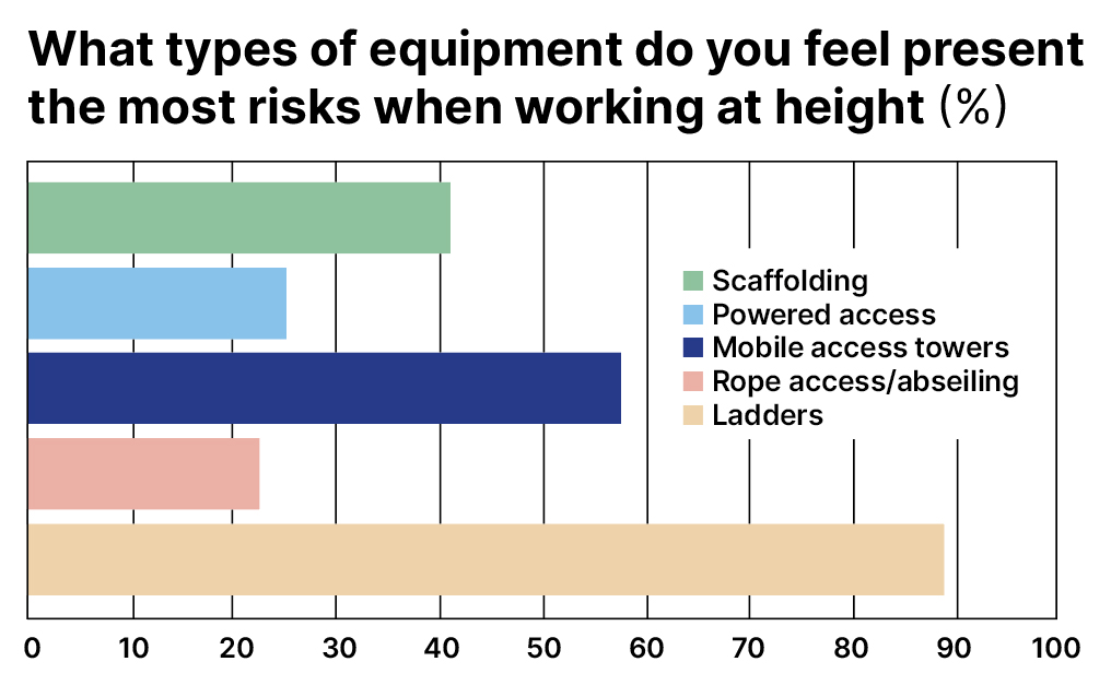 When it comes to the types of equipment that they feel present the most risks, ladders were highlighted (88.8% of respondents) as posing one of the biggest dangers. That was followed by mobile access towers (56.6%) and scaffolding (41.3%).