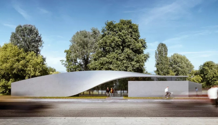 The design of Cube nods to the possibilities of C-cubed, as the material is known. Henn says the merging of roof and wall suggests “a future architecture where environmentally conscious design is paired with formal freedom and radical rethinking of the most basic architectural elements”.