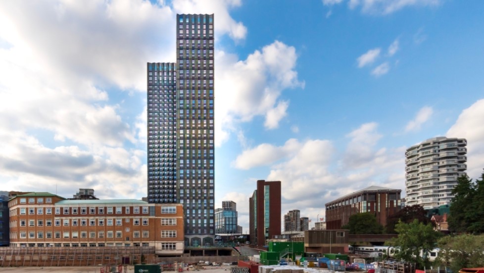 The project, built by Tide Construction and Vision Modular Systems, and designed by architect HTA, consists of 546 homes in a pair of 38- and 44-storey towers.